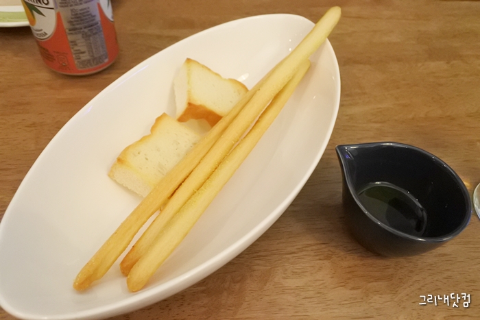 식전빵으로 나온 그리시니, 간만이라 아주 반가웠고 발사믹오일도 맛있었고