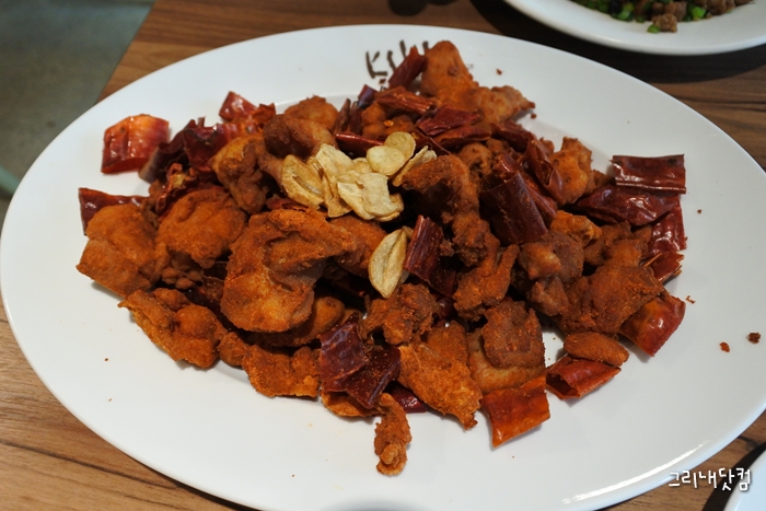 건고추와 닭고기 볶음은 잘 튀겨진 순살닭튀김에 라면스프랑 흡사한 맛이나는
