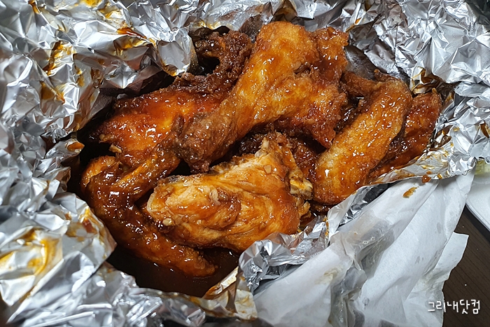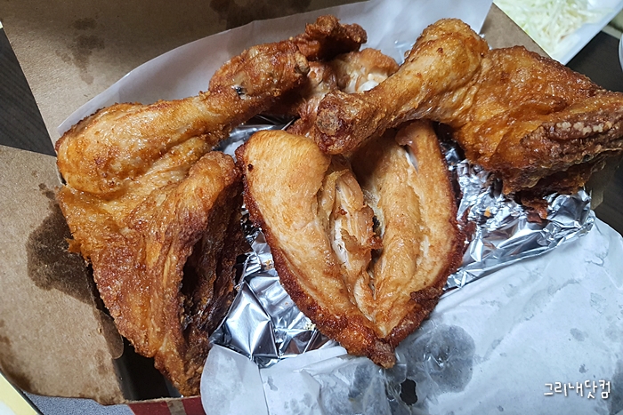 땅땅치킨. 양념구이 매콤하게 주문해서 양배추에 싸먹으니 대존맛