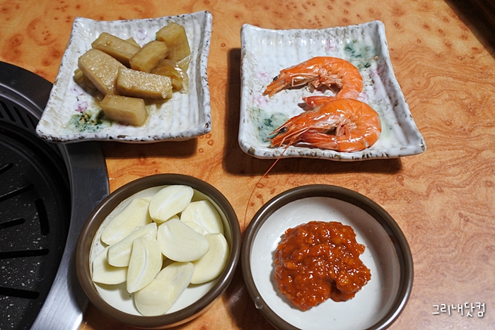주문은 된장박이 3인분. 고기에 앞서 반찬을 여러가지 내어주시는데 하나같이