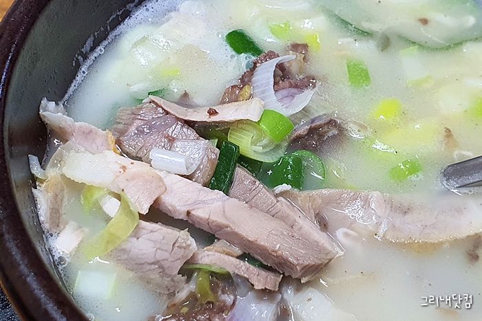 사골국물 베이스의 순대국밥을 먹는 느낌이었고 고기들이 얇게 썰어져 있어서