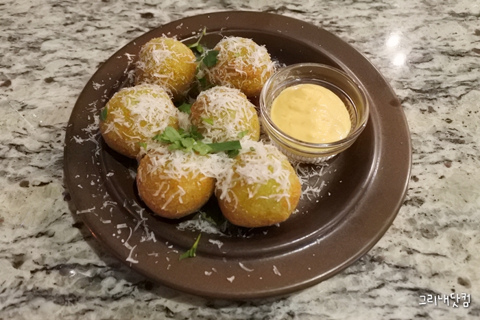 아란치니를 주문했고 청포도스파클링과 화이트와인사워라는 음료를 곁들였다.