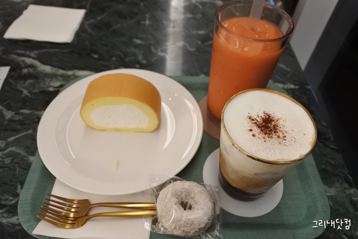 주스는 상큼하고 맛있었으며 케이크도 머랭 시트 치즈 모두 골고루 맛있었고