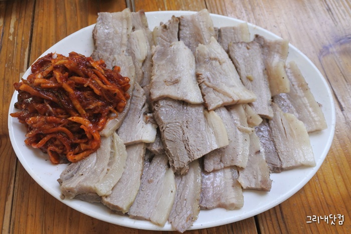 수육은 삼겹부위로 보이는데 잘 삶아서 부드럽고 김치랑도 잘 어울리는 맛